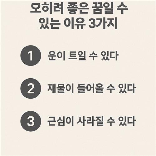 💡 TIP: 꿈 해석은 마음의 방향을 정해주는 나침반일 뿐입니다. 현실에 집착하지 말고, 긍정적인 마음가짐을 유지하는 것이 훨씬 더 중요합니다.