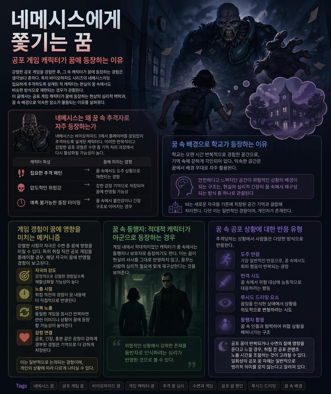 네메시스 꿈, 공포 게임 꿈, 바이오하자드 꿈, 게임 캐릭터 꿈, 추격 꿈 심리, 수면과 게임, 공포 꿈 원인, 루시드 드리밍, 꿈 속 배경