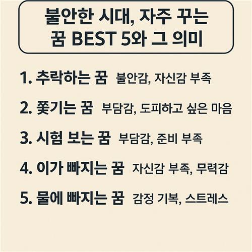 우리의 꿈은 종종 마음속 깊은 곳의 이야기를 조용히 들려주곤 해요. 불안한 시대일수록, 꿈은 우리가 놓치고 있는 감정을 비추는 거울이 되어줍니다. 이번 글을 통해 여러분의 꿈에 담긴 메시지를 조금이나마 이해할 수 있는 시간이 되었기를 바랍니다.