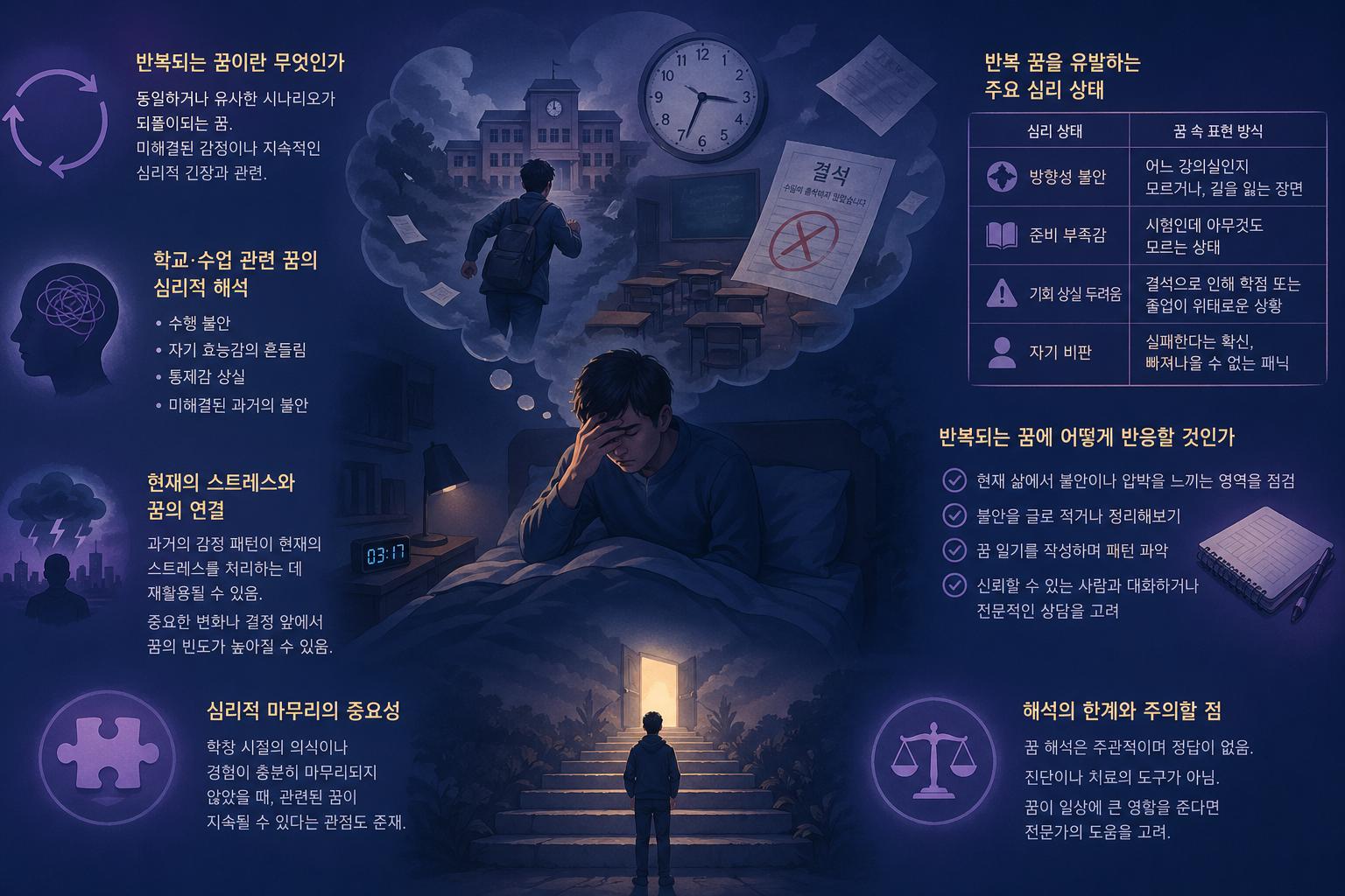특히 '학교에서 수업을 빠졌다', '시험 준비를 못 했다', '졸업 요건을 채우지 못했다'는 유형의 꿈은 전 세계적으로 매우 보편적으로 보고되며, 단순한 과거 기억의 재생이 아닌 현재 심리 상태의 투영으로 해석되는 경우가 많다.
